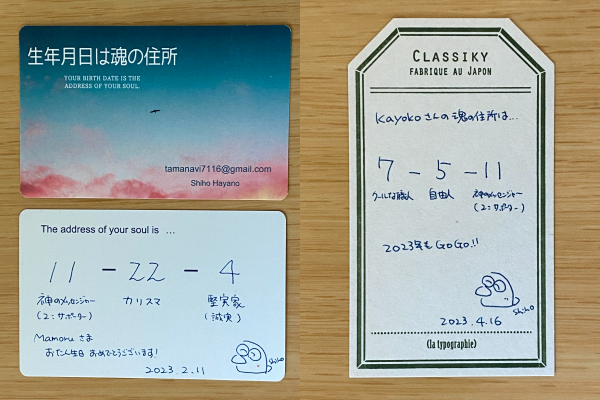 お伝えする三つの誕生数(過去数ー現在数ー未来数)が、まるで住所の番地のように見えるので、”魂の住所”と名前をつけました。(覚えやすいと好評です)